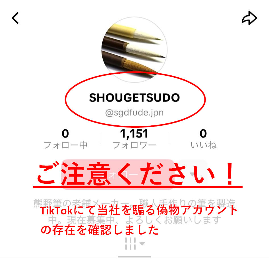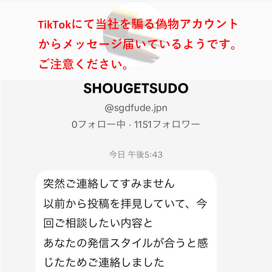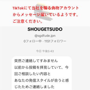 TikTokにて当社を騙る偽アカウント(sgdfude.jpn)の存在を確認いたしました。